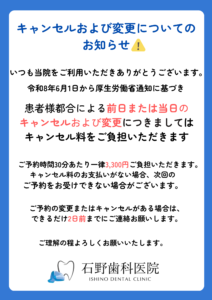 いつも石野歯科医院をご利用いただきありがとうございます。 令和8年6月1日より、厚生労働省通知に基づき、患者様都合による前日または当日のキャンセル・ご変更につきましては、キャンセル料をご負担いただくこととなりました。